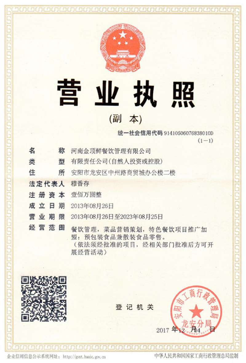 2002年穆香存女士為把事業(yè)做大做強(qiáng),把精心研發(fā)的項目推向市場,決定走連鎖加盟發(fā)展道路,讓有能力的人、熱愛餐飲行業(yè)的人來運作。2003年元月份起,金頂鮮寧夏系列特色項目在河南先推廣開來,2006年改組成立股份制企業(yè),注冊“金頂鮮”系列商標(biāo),2010年2月14日公司拿到商標(biāo)證(早期注冊需用時3年左右,現(xiàn)在效率高,從注冊日期算起,大概兩年下來商標(biāo)大證)。公司在隨后經(jīng)營發(fā)展的幾年,又陸續(xù)花巨資注冊/并購50多個商標(biāo)來保護(hù)自主品牌。“胡羊排“就是典型代表,2013年8月份向國家商標(biāo)局遞交申請,2015年12月21日“胡羊排”商標(biāo)成功注冊。目前遍及河南、河北、山西、山東、安徽、浙江、江蘇、陜西、廣西、東北、甘肅、江西、四川、新疆等省份,已擁有500余家加盟分店。