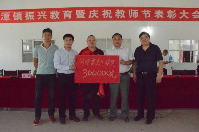 9月8日上午,在唐河縣源潭鎮(zhèn)舉辦的“振興教育事業(yè)暨慶祝第三十三個(gè)教師節(jié)表彰大會(huì)”上,該鎮(zhèn)黨委書記郭坡充滿感激地從金頂鮮餐飲管理有限公司總經(jīng)理何恒震手中接過首筆“源潭鎮(zhèn)恒震教育獎(jiǎng)勵(lì)基金”注入30萬元。郭書記滿含深情地在大會(huì)上講到:“今天這個(gè)日子值得我們?cè)刺督逃懹洠@是我們?cè)刺督逃聵I(yè)的一件大事,也充分說明我們?cè)刺督逃牧硪环N成功。我們唯有以全心全意的方式繼續(xù)辦好的教育,讓家鄉(xiāng)多出人才,才能更好更全面地加快我們自身的發(fā)展?!?