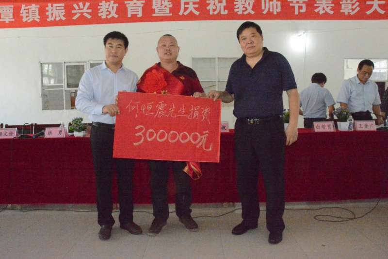 9月8日上午,在唐河縣源潭鎮(zhèn)舉辦的“振興教育事業(yè)暨慶祝第三十三個(gè)教師節(jié)表彰大會(huì)”上,該鎮(zhèn)黨委書記郭坡充滿感激地從金頂鮮餐飲管理有限公司總經(jīng)理何恒震手中接過首筆“源潭鎮(zhèn)恒震教育獎(jiǎng)勵(lì)基金”注入30萬元。郭書記滿含深情地在大會(huì)上講到:“今天這個(gè)日子值得我們?cè)刺督逃懹洠@是我們?cè)刺督逃聵I(yè)的一件大事,也充分說明我們?cè)刺督逃牧硪环N成功。我們唯有以全心全意的方式繼續(xù)辦好的教育,讓家鄉(xiāng)多出人才,才能更好更全面地加快我們自身的發(fā)展?!?